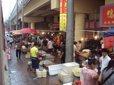 バス停を下りて、西へ道沿いに歩いて行くと、脇に下り坂が。それを下っていくと、ここにも大きな市場が。中に入ると、肉や野菜、魚などの生鮮食品や、中国餅、涼皮といった小吃類、マントウ、バオズといった主食類がたくさん。買い物の時間になると、ここは大にぎわい。道路の下なので、雨の日でも安心!その他周辺には、快餐店やビール屋、マージャン屋なども。